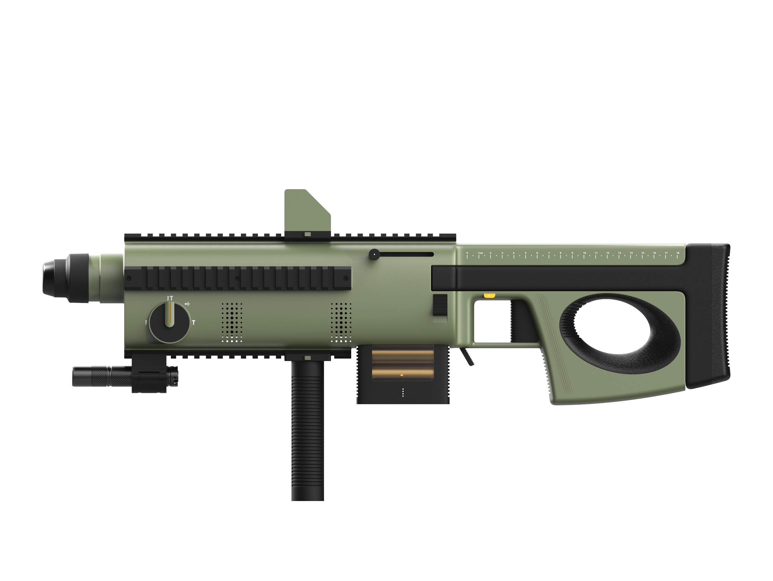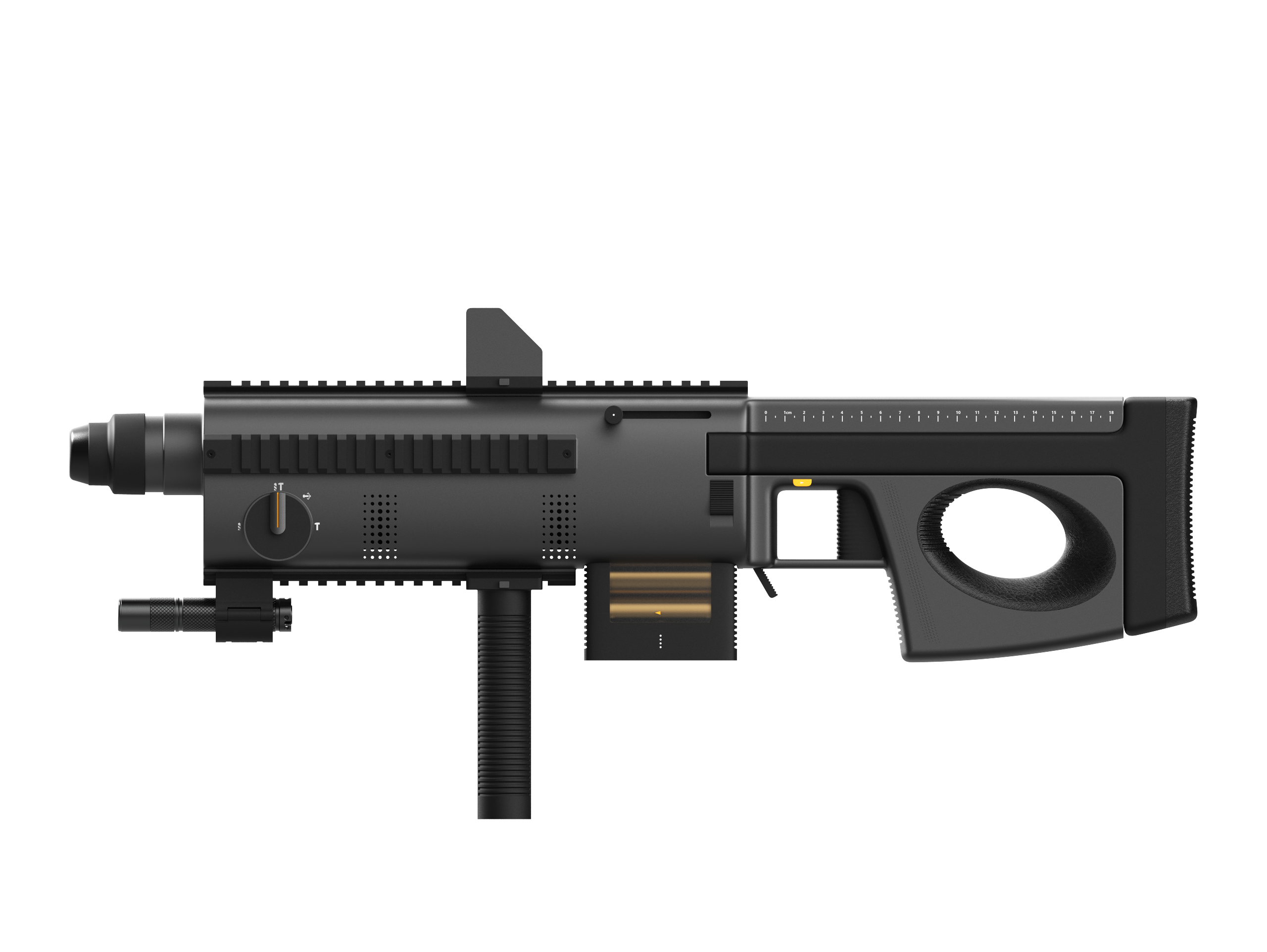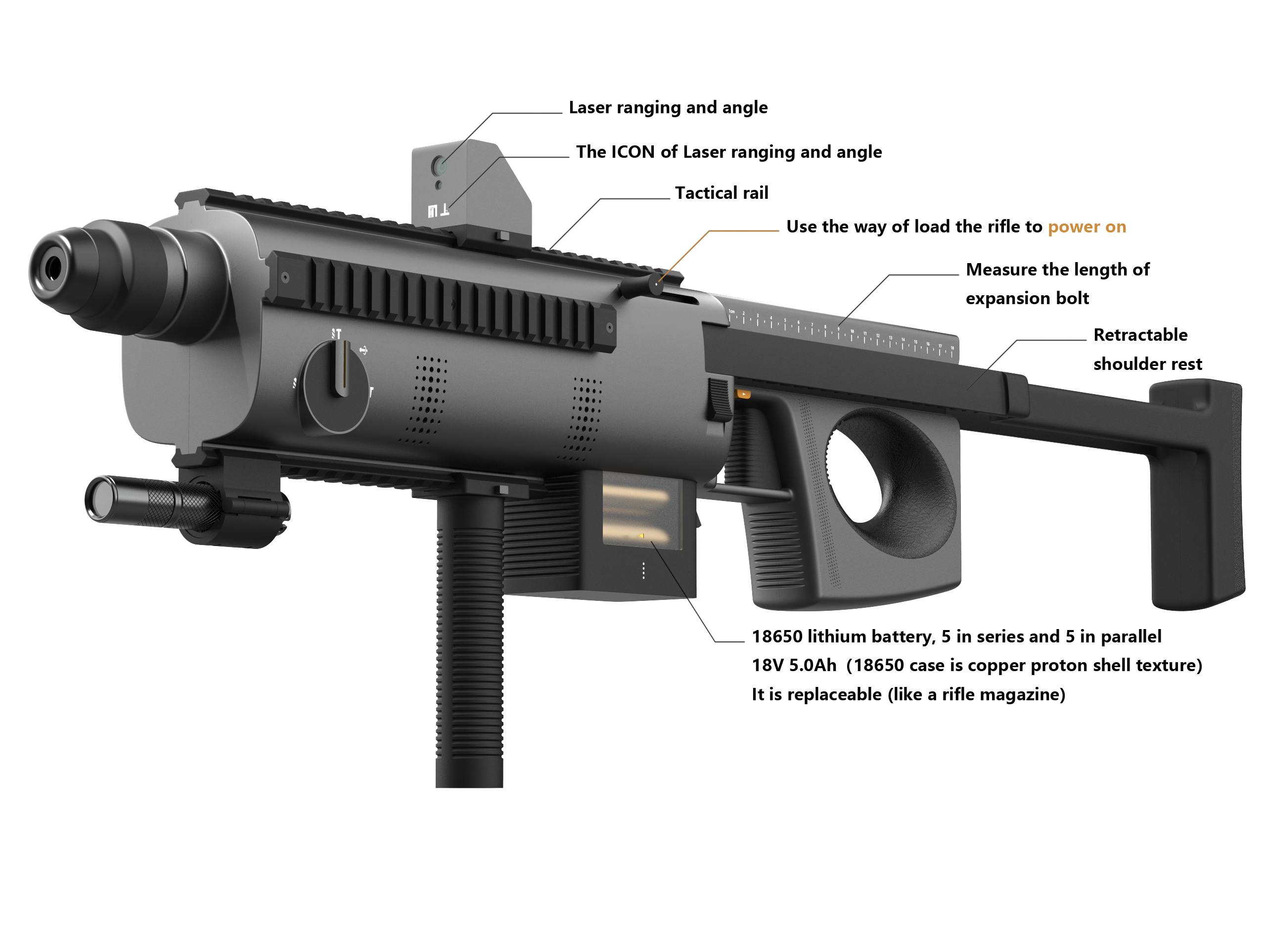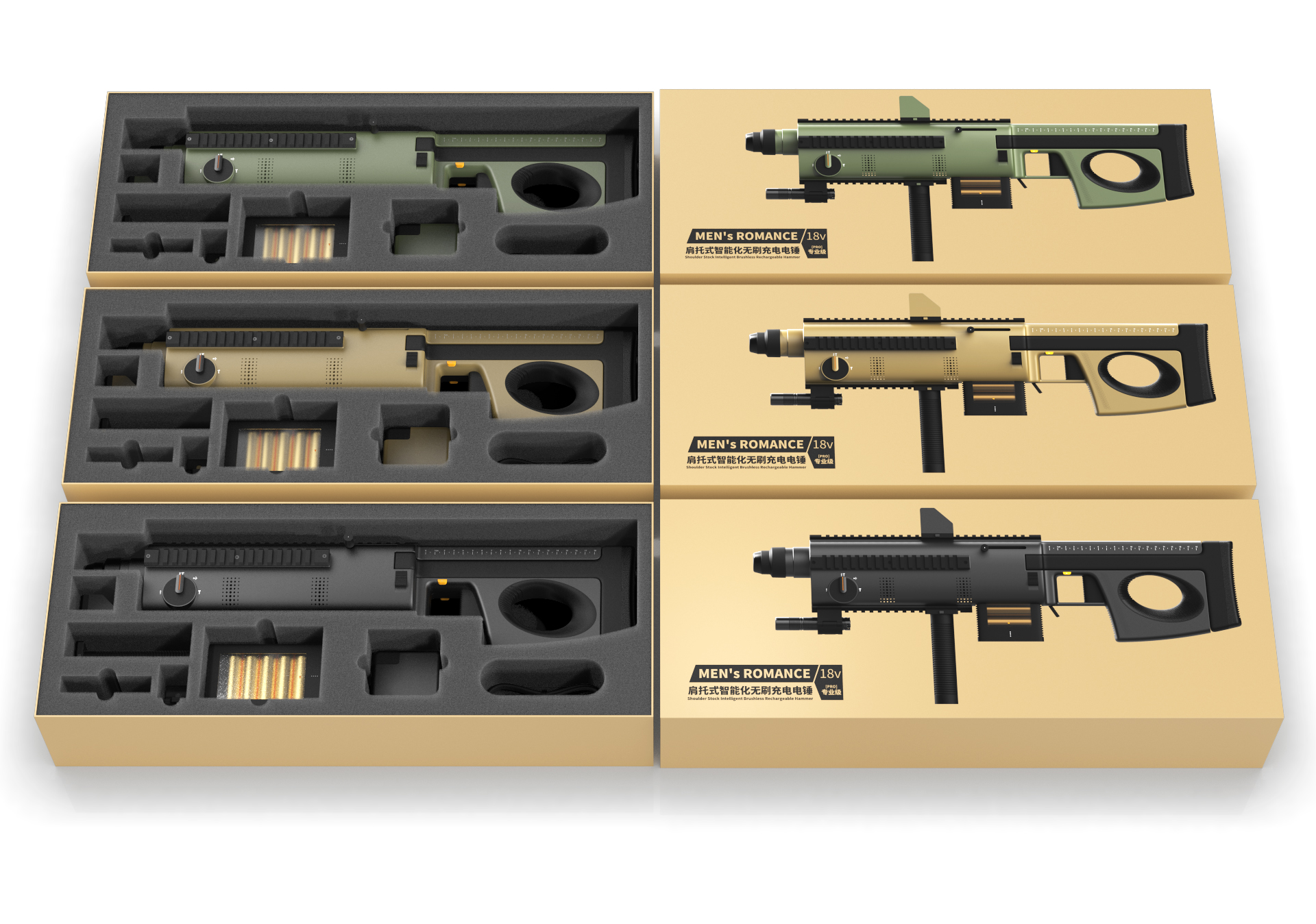 Service value:1. It redefines the human-machine interaction for electric hammers. The overall "firearm"shape & structure, equipped with a retractable shoulder stock, allows users to adopt a drilling posture similar to firing a shoulder-stocked rifle when drilling into walls. This enables users to fully utilize their core muscle groups to apply thrust and control force to the drill bit, transforming the traditional "hand-pushing-against-wall drilling mode" into an "American football player forward-leaning collision mode." This maximizes work efficiency, enhances controllability, and expands the suitable user base for electric hammers. 2. It features an intelligent posture and drilling
